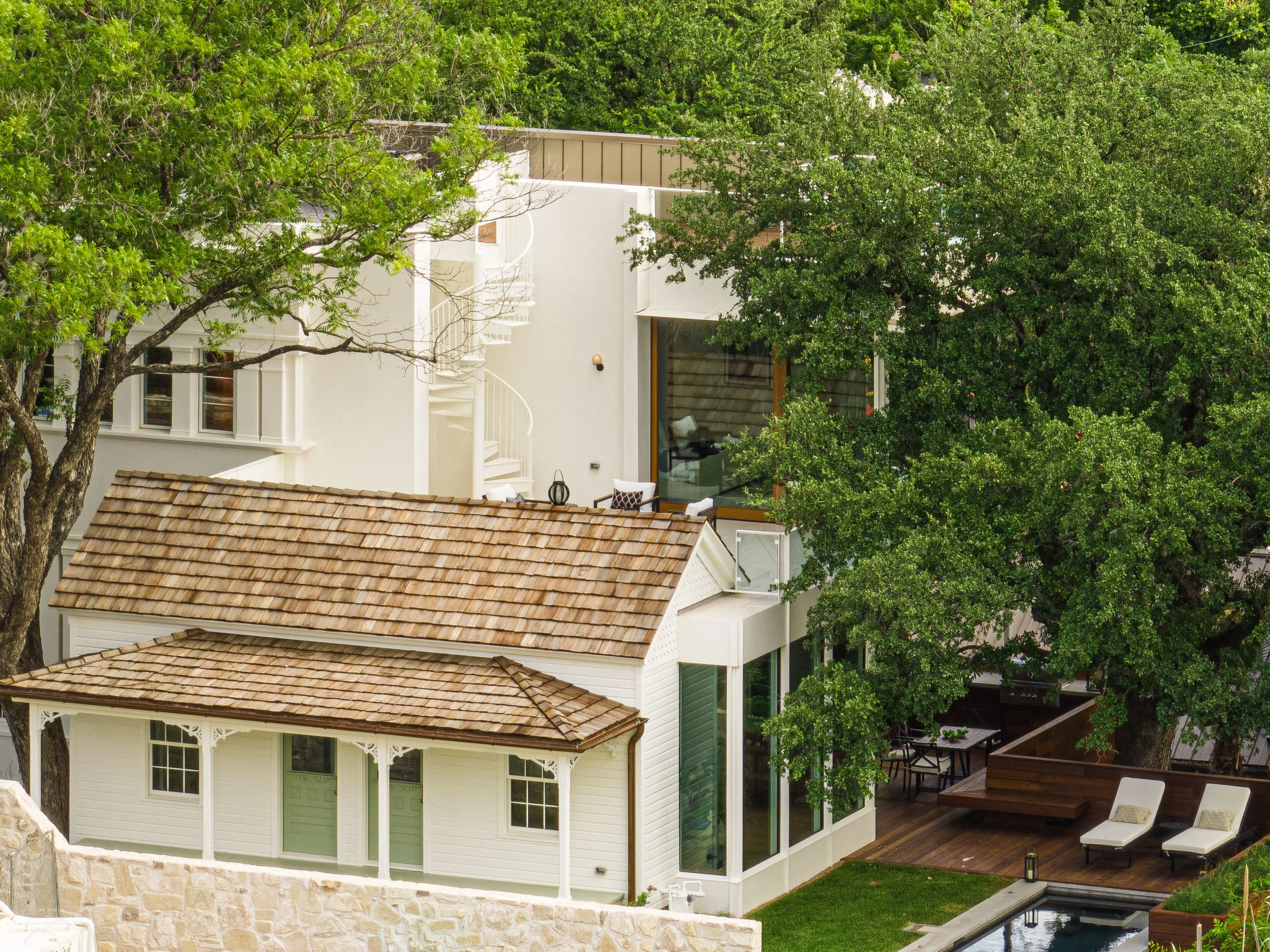 A large Austin residential compound with a substantial main house, a fully equipped guest house, and outdoor spaces arranged for entertaining and everyday family use.