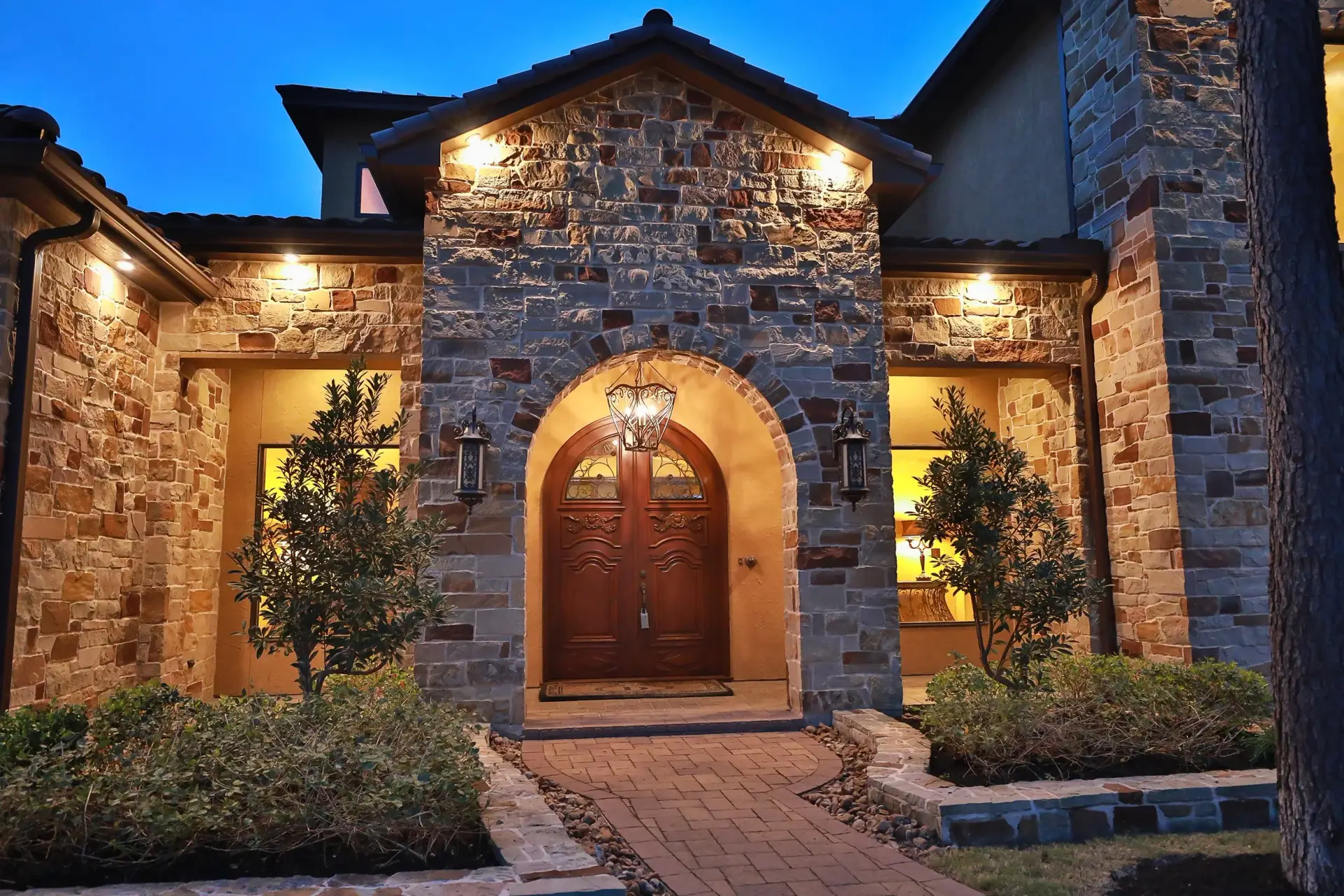 A larger luxury residence with stone-and-wood curb appeal, deep site presence, and a backyard sequence that reinforces the home’s estate-like character.